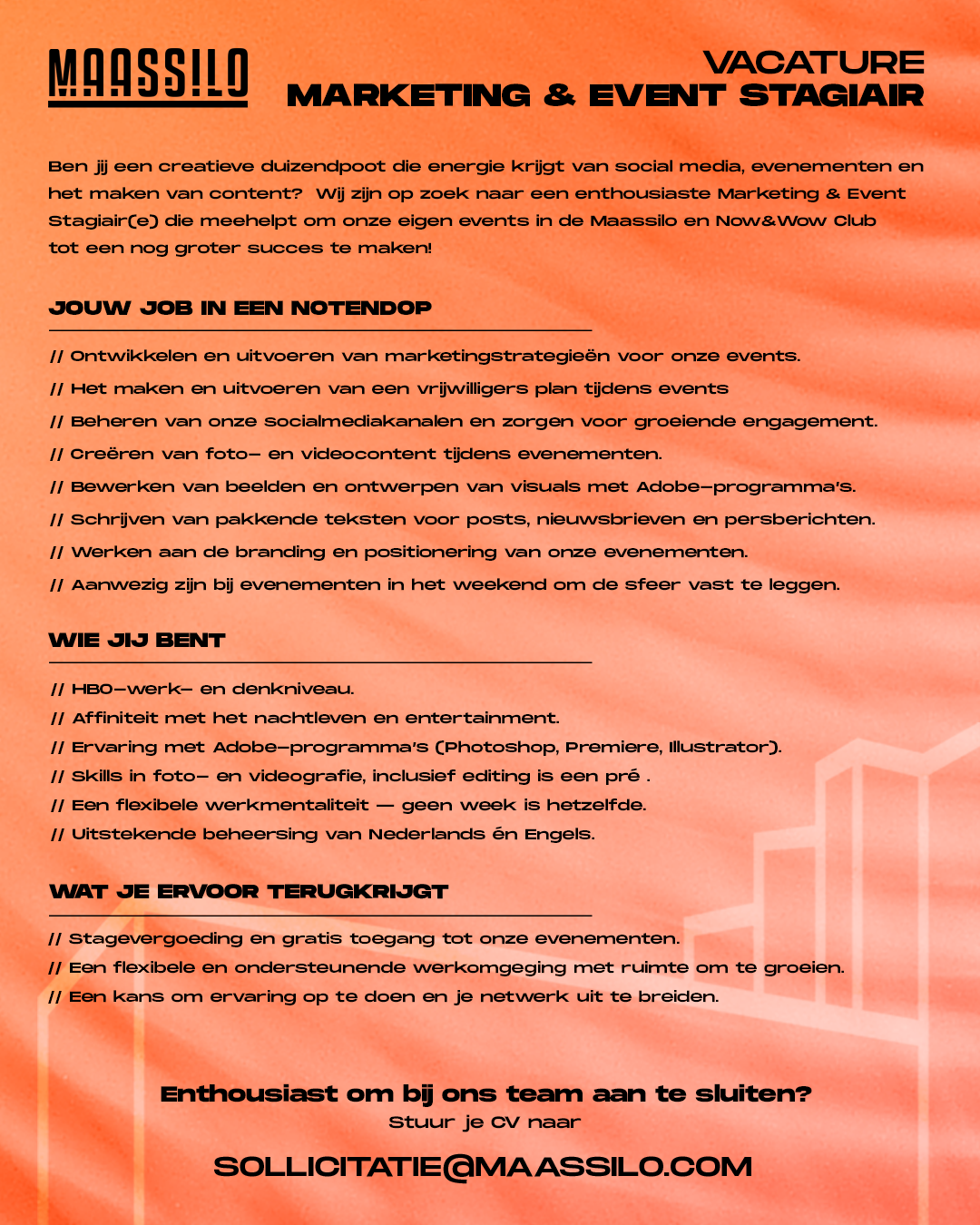 Altijd al willen werken in de Maassilo? Hieronder vind je een lijst van beschikbare vacatures. Zit er niets voor jou tussen? Neem dan contact op via ons contactformulier, stuur een e-mail naar sollicitatie@maassilo.com of neem telefonisch contact op via +31 (0)10 476 24 52.